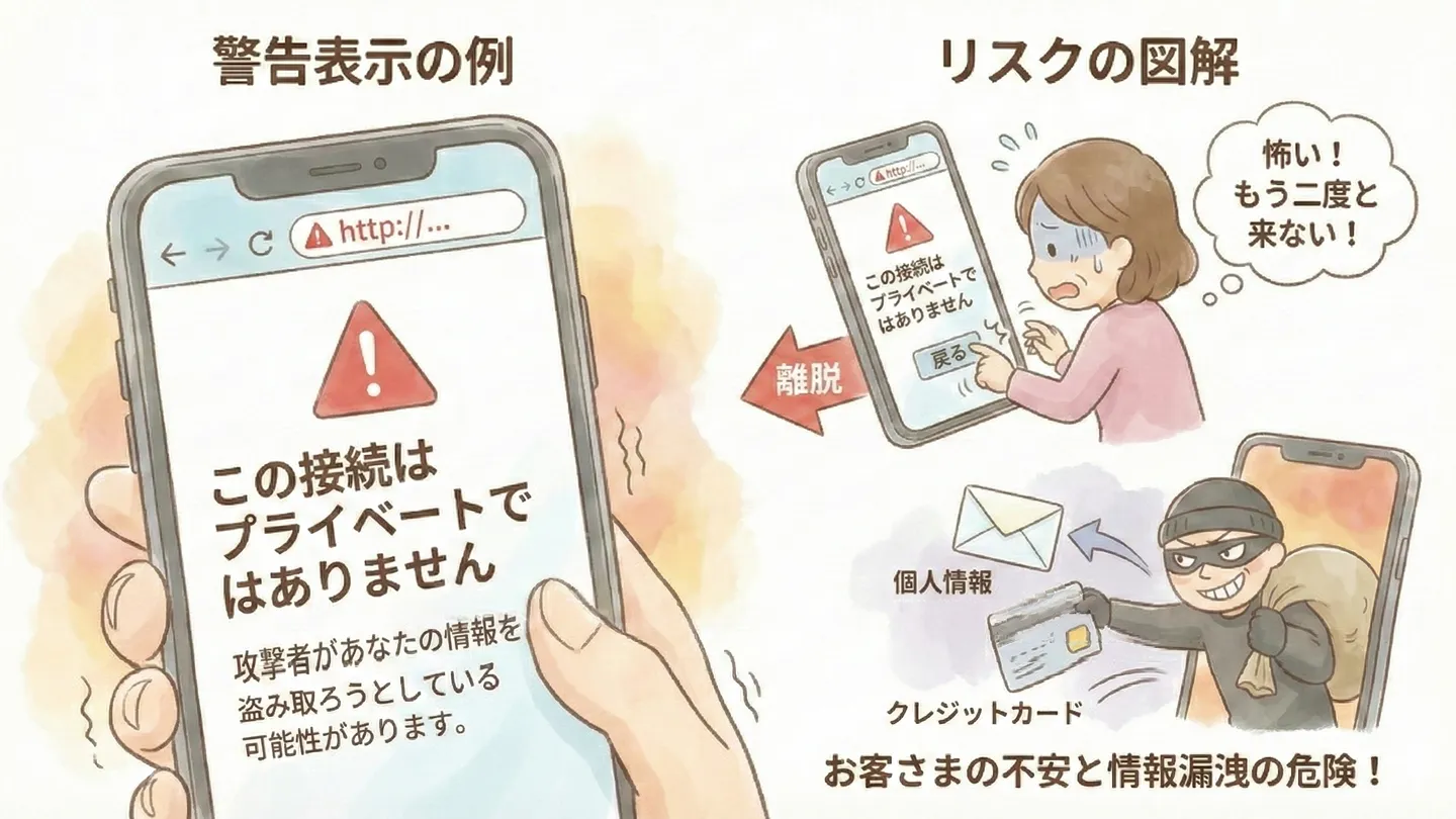 サイトにアクセスしようとすると、「保護されていない通信」という警告を画面に大きく表示して、お客さまに注意を促すのです。こんな警告が出たら、お客さまは不安になって、すぐにあなたのサイトから離れてしまいますよね。