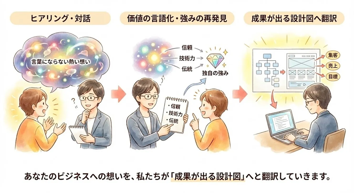 成果の出るWebサイトは、単なる作品ではなく**「伝わる仕組み」です 。 私たちは、デザイン作業に入る前の設計に9割の力**を注いでいます 。+1