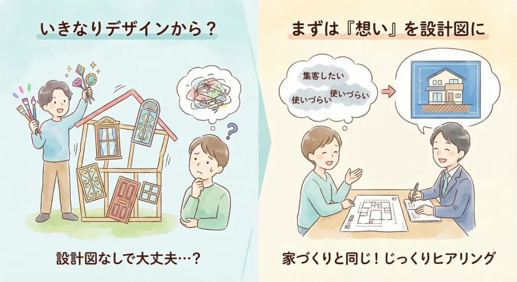 でも、どんなご相談であっても、私たちが最初から「デザイン(見た目)」の話をすることは、まずありません。