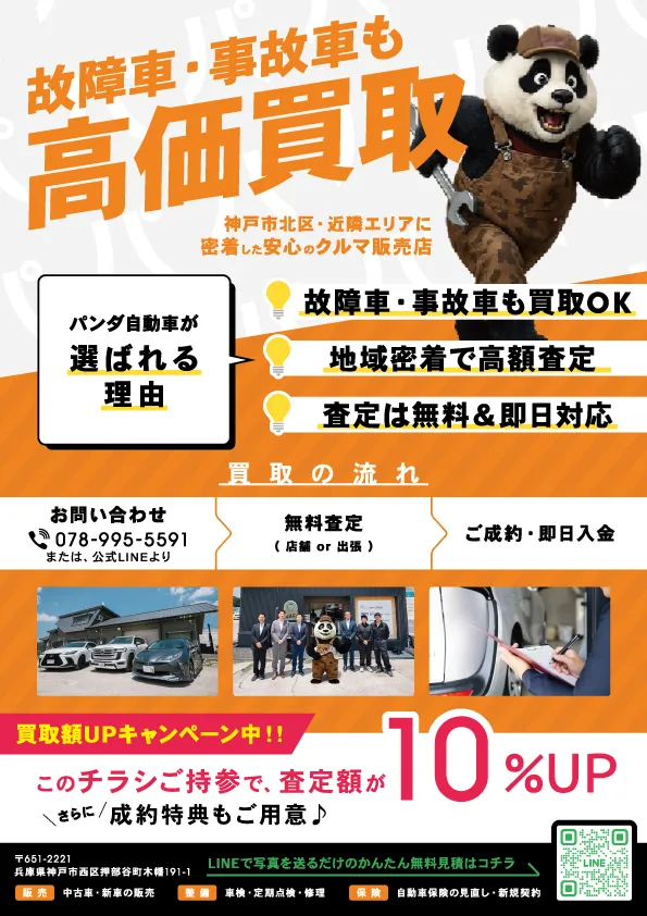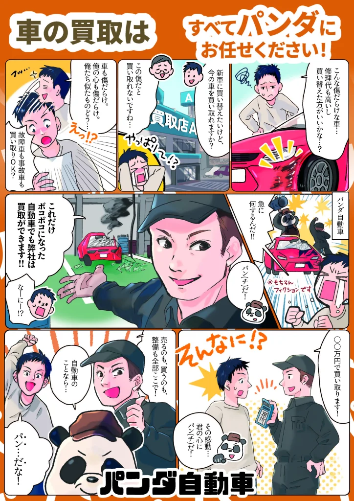 「#パンダが全部やってくれる🚗」「車のことなら、全部パンダ自動車におまかせ」